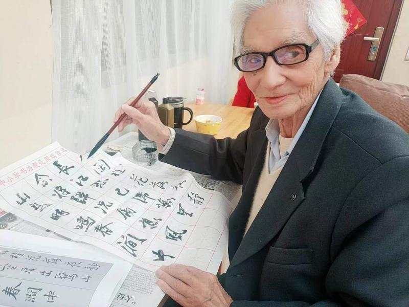 尊长在院内训练书法